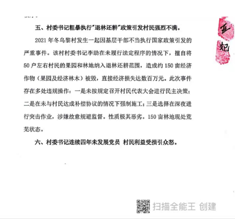 2021年末,李助书记滥用职权,擅自将约50户村民的果园和林地纳入"退林还耕"范围,操作时,其既没有召开全体村民会议,又未召开村民代表会议,也未按照“退林还耕”政策实施,而是选择在深夜违规突击作业,不顾村民们的死活,将村民们约150亩经济作物(果园及经济林木)推毁,造成经济损失数百万元。