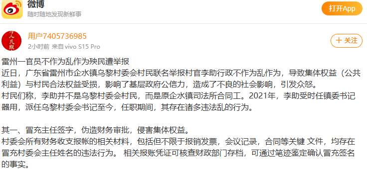 近日,广东省雷州市企水镇乌黎村委会村民联名举报村官李助行政不作为乱作为,导致集体权益(公共利益)与村民合法权益受损,影响了基层政府公信力,造成了不良的社会影响,引发众怒。